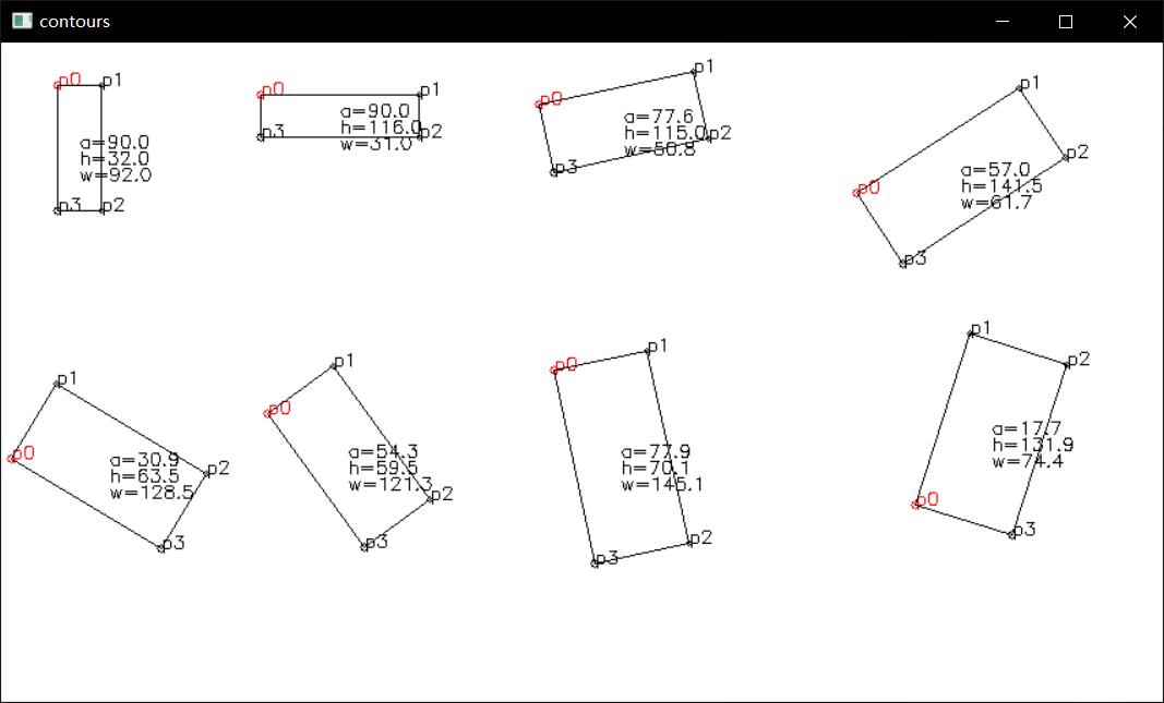 网上其他文章说是按Y值最大,X值最小的为p0, 但光两个函数返回的RotatedRect都不同, 我觉得没有参考价值, 我本机测试是Y值最大,X值最小的为p3,然后依据p0~3的顺序得到顶点, 再由顶点得到height和width, angle则是p0-p3的直线与X轴这条直线(不是X轴正方向)形成的锐角, angle取值范围是[0,90], 上图: