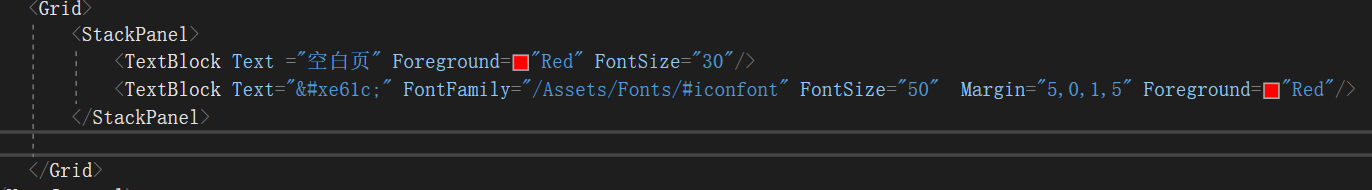 3. XMAL引用图标,可通过Textblock引用,Text="图标代号",如Text="" FontFamily="路径",如FontFamily="/Assets/Fonts/#iconfont"