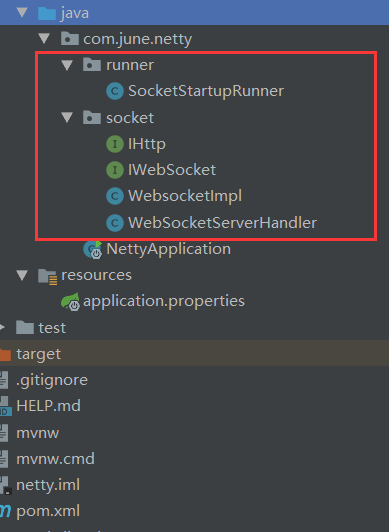 项目使用的是springboot,然后把socket初始化放在项目启动之后,而不是网上广为流传的使用另外的main方法启动,下图是主要文件: