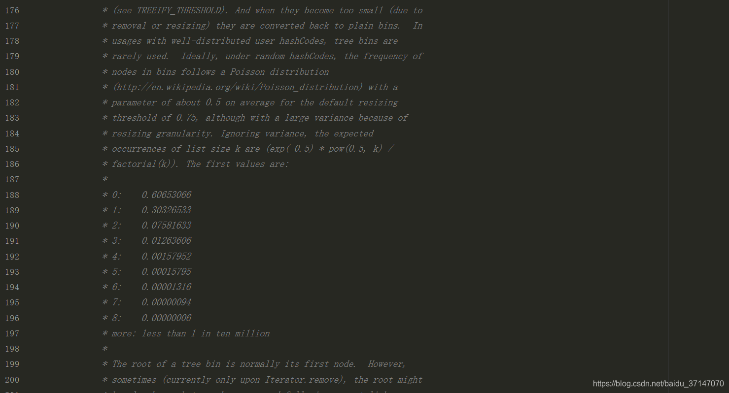 源码上说,为了配合使用分布良好的hashCode,树节点很少使用。并且在理想状态下,受随机分布的hashCode影响,链表中的节点遵循泊松分布,而且根据统计,链表中节点数是8的概率已经接近千分之一,而且此时链表的性能已经很差了。所以在这种比较罕见和极端的情况下,才会把链表转变为红黑树。因为链表转换为红黑树也是需要消耗性能的,特殊情况特殊处理,为了挽回性能,权衡之下,才使用红黑树,提高性能。也就是大部分情况下,hashmap还是使用的链表,如果是理想的均匀分布,节点数不到8,hashmap就自动扩容了。为什么这么说呢,再看下图