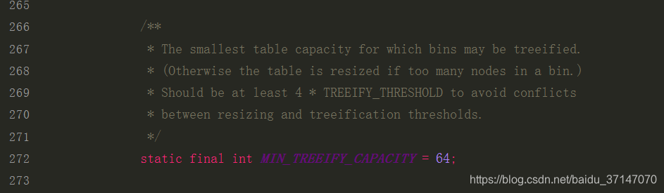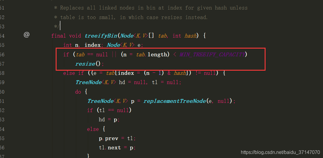在链表转变为红黑树方法中,有这样一个判断,链表长度小于MIN_TREEIFY_CAPACITY,就会扩容,而不是直接转变为红黑树,可不是什么链表长度为8就变为红黑树,要仔细看代码哟,还有别的条件呢,