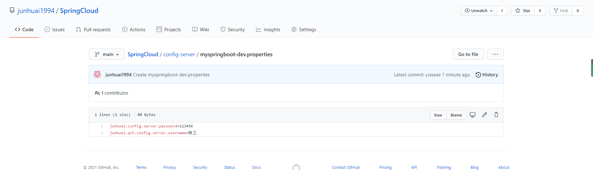 登录GitHub,新建一个public仓库:config-server,并且添加测试项目对应的配置文件:myspringboot-dev.properties,并设置几个值