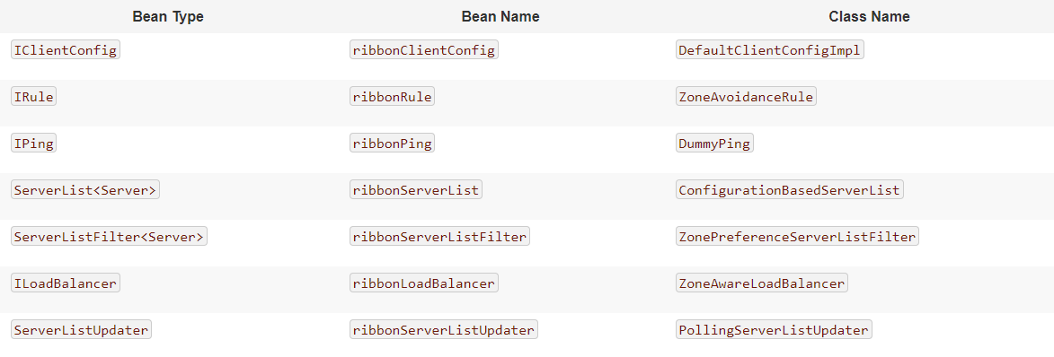 下表显示了Spring Cloud Netflix默认为Ribbon提供的bean: