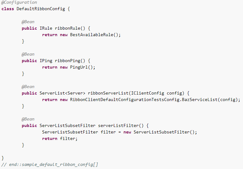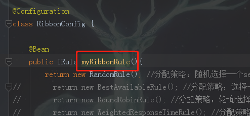 @EnableEurekaClient @RibbonClient(name = "RibbonConfig", configuration = RibbonConfig.class) @SpringBootApplication public class SpringbootSpringdataJpaApplication{ public static void main(String[] args) { SpringApplication.run(SpringbootSpringdataJpaApplication.class, args); } } @Configuration class RibbonConfig { @Bean public IRule ribbonRule(){ return new RandomRule(); //分配策略:随机选择一个server // return new BestAvailableRule(); //分配策略:选择一个最小的并发请求的server,逐个考察Server,如果Server被tripped了,则忽略 // return new RoundRobinRule(); //分配策略:轮询选择,轮询index,选择index对应位置的server // return new WeightedResponseTimeRule(); //分配策略:根据响应时间分配一个weight(权重),响应时间越长,weight越小,被选中的可能性越低 // return new ZoneAvoidanceRule(); //分配策略:复合判断server所在区域的性能和server的可用性选择server // return new RetryRule(); //分配策略:对选定的负载均衡策略机上重试机制,在一个配置时间段内当选择server不成功,则一直尝试使用subRule的方式选择一个可用的server } @Bean public IPing ribbonPing() { return new PingUrl(); } @Bean public ServerListSubsetFilter serverListFilter() { ServerListSubsetFilter filter = new ServerListSubsetFilter(); return filter; } }
