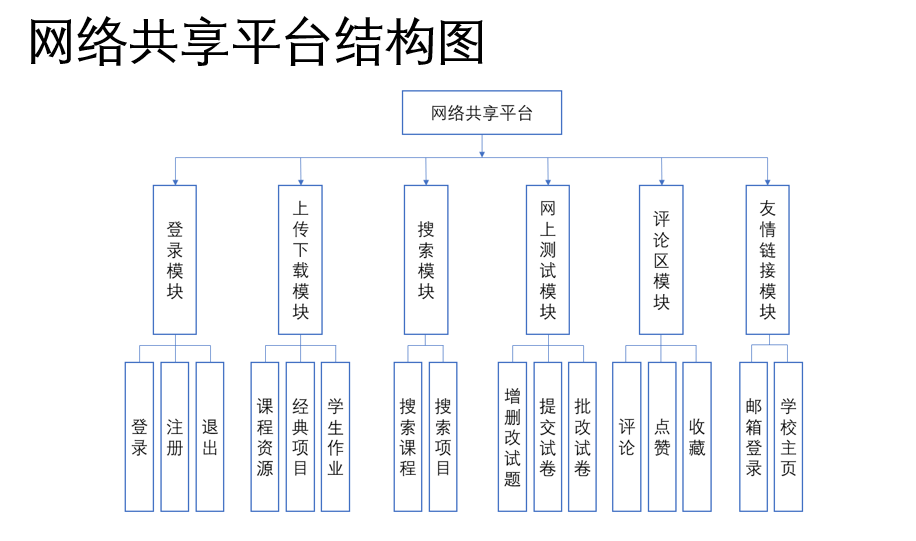 本项目主要实现网络教学共享平台的教学资源共享(如优秀的项目,课件等等),提供对教学资源的上传和下载;提供在线创建测验,在线改分等。