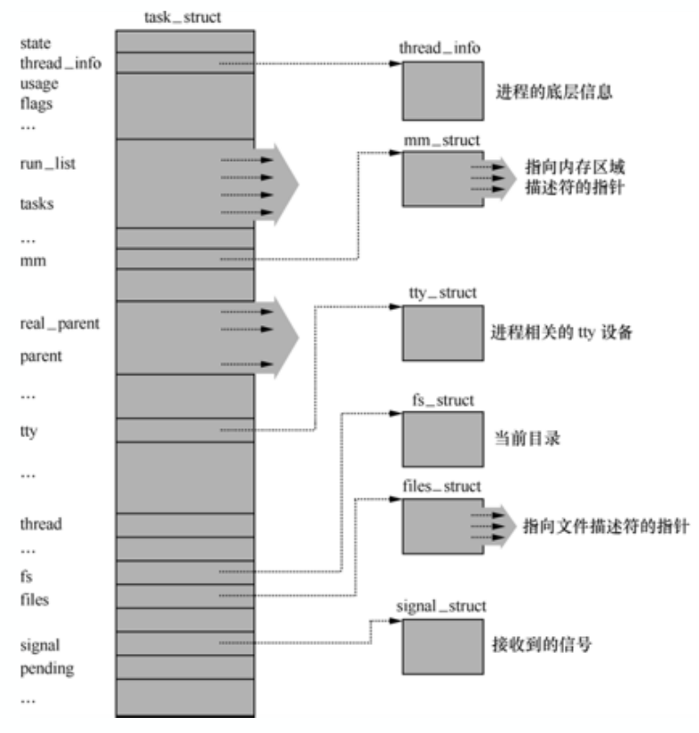 其中有进程的状态、进程双向链表的管理,以及控制台tty、文件系统fs的描述、进程打开文件的文件描述符files、内存管理的描述mm,还有进程间通信的信号signal的描述等