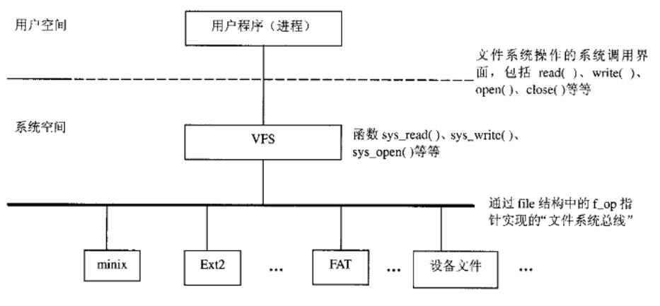 - 第一层为文件系统接口层,如open、write、close等系统调用接口。