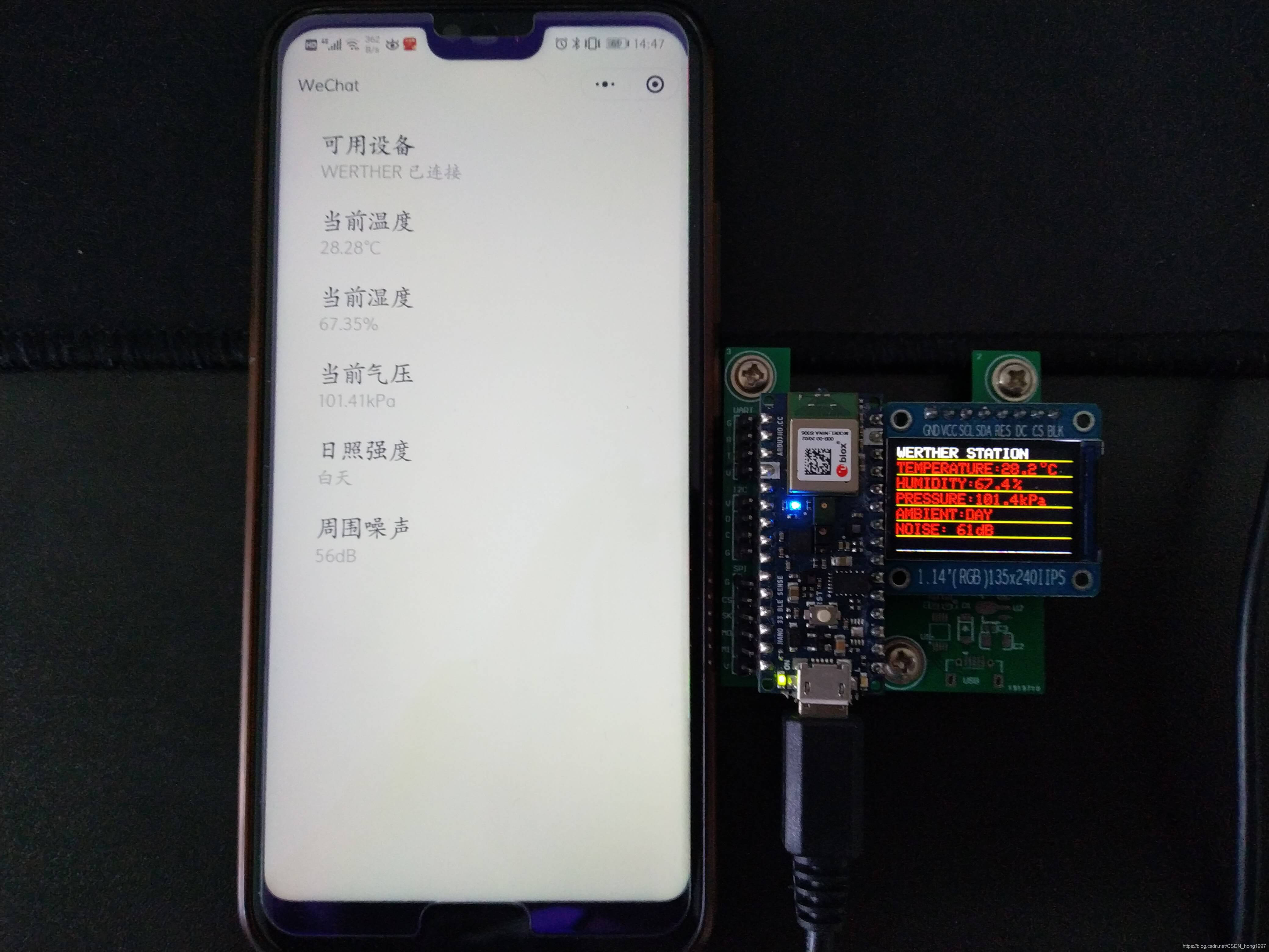 本次在LCD屏幕和微信小程序上显示了:周边环境温度、周边环境湿度、大气压强、判断白天和夜晚以及周边平均噪声。