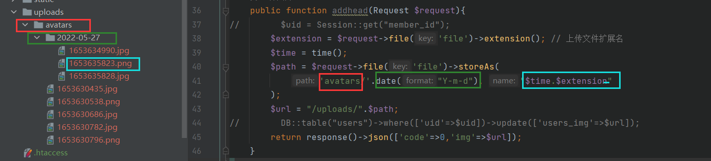 //上传图片 public function addhead(Request $request){ // $uid = Session::get("member_id"); $extension = $request->file('file')->extension(); // 上传文件扩展名 $time = time(); $path = $request->file('file')->storeAs( 'avatars/'.date("Y-m-d"), "$time.$extension" ); $url = "/uploads/".$path; // DB::table("users")->where(['uid'=>$uid])->update(['users_img'=>$url]); return response()->json(['code'=>0,'img'=>$url]); }