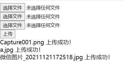 <!DOCTYPE html> <html lang="en"> <head> <meta charset="UTF-8"> <title>C语言中文网——PHP文件上传</title> </head> <body> <form action="" method="post" enctype="multipart/form-data"> <input type="file" name="upfile[]"><br> <input type="file" name="upfile[]"><br> <input type="file" name="upfile[]"><br> <input type="submit" value="上传"> </form> </body> </html> <?php if(!empty($_FILES)){ $tmpname = $_FILES['upfile']['tmp_name']; $name = $_FILES['upfile']['name']; $path = './uploads'; for ($i=0; $i < count($tmpname); $i++) { $file_name = date('YmdHis').rand(100,999).$name[$i]; if(move_uploaded_file($tmpname[$i], $path.'/'.$file_name)){ echo $name[$i].' 上传成功!<br>'; }else{ echo $name[$i].' 上传失败!<br>';
