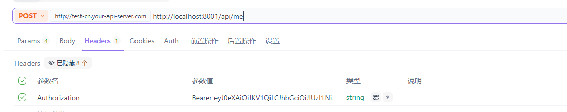 参数值:Bearer eyJ0eXAiOiJKV1QiLCJhbGciOiJIUzI1NiJ9.eyJpc3MiOiJodHRwOi8vbG9jYWxob3N0OjgwMDEvYXBpL2xvZ2luIiwiaWF0IjoxNzUwMTQ0MDUxLCJleHAiOjE3NTAxNDc2NTEsIm5iZiI6MTc1MDE0NDA1MSwianRpIjoiOWJBNmhmczNkYzNiWkhMQiIsInN1YiI6IjYiLCJwcnYiOiI0OGY3ZTRjNTg0YmYwNTBkMmYzZmU2ODJjMGE2OTM0ZWMyODkxMThlIn0.tV_r3bs5DNFJtGyS9hzf5tA-WpVhce1jbX1yc1-SCaU