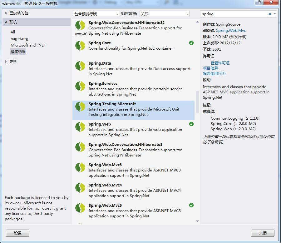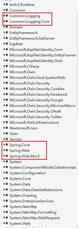 Spring.Core、Common.Logging、Spring.Web.Mvc、Spring.Web.Mvc5;