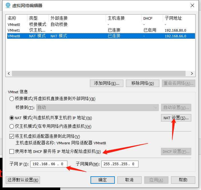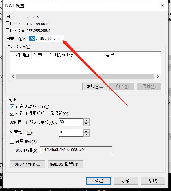 编辑==>虚拟网络编辑器==>选择NAT==》更改配置