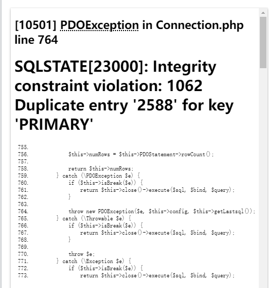 主键冲突1062 Duplicate entry '2588' for key 'PRIMARY'(tp5.0升级5.1)