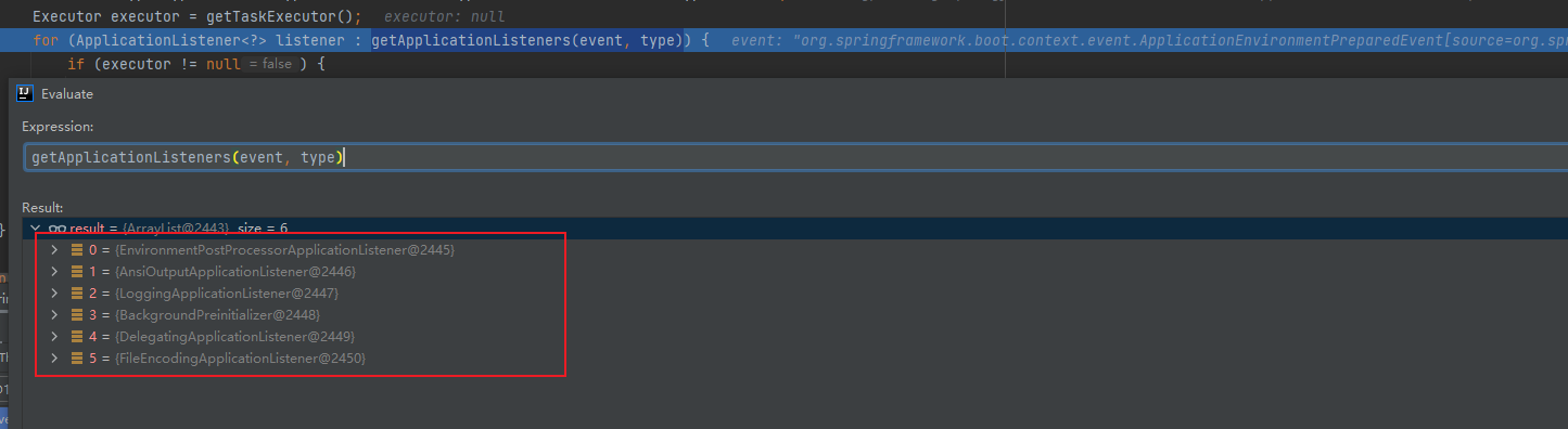 // 获取到所有ApplicationListener,遍历调用,下面有截图获取到的所有监听器