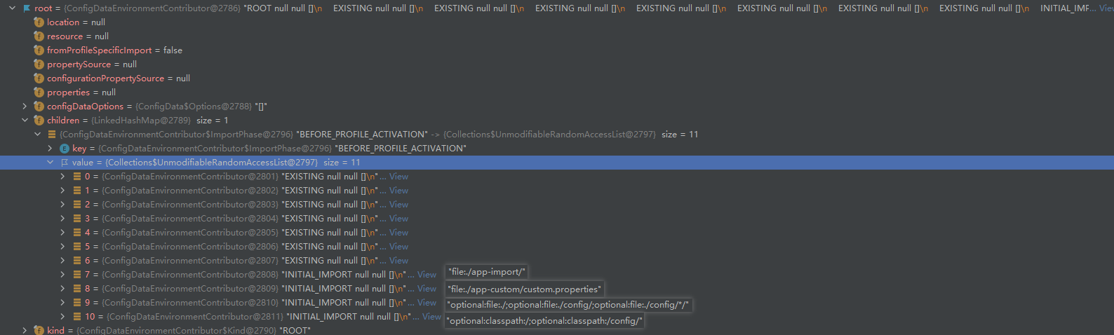 在经过配置数据配置解析后的记过为ConfigDataResolutionResult集合,ConfigDataResolutionResult中包含了配置数据位置,以及配置数据资源