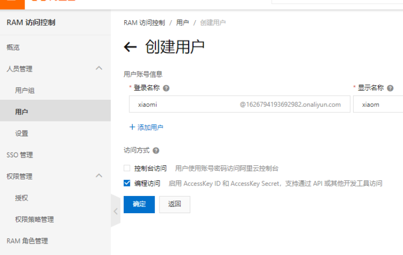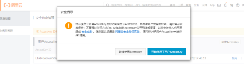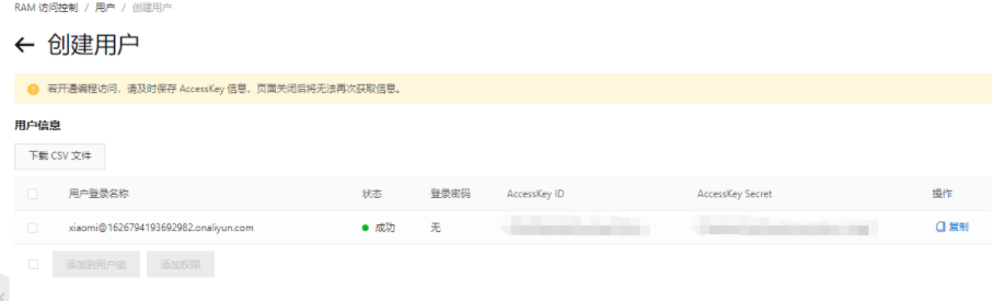 5、创建完毕后,会出现下面的页面,我们可以看到创建的accessKeyId、AccessKeySecret