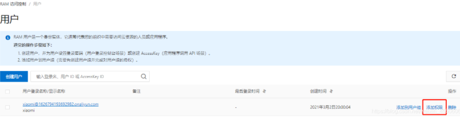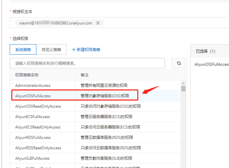 7、为改用户添加oss操作权限(根据实际情况也可以选择全部权限或同时添加其他权限)