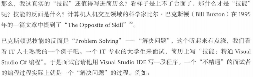 书中引用了巴克斯顿的观点后,举了一个大学生来面试的例子。在举例中,该大学生在自认为“精通”的编程工具和编程语言中遇到了很多低层次问题,如怎么定义数组、缺少分号等。然后作者话锋一转,开始探讨如何提高技能,以解决高层次的问题。在举例中,大学生正因为不具备“skill”,才花费了许多时间在“解决(低层次)问题”上,可以理解为“The Opposite of Skill”是“Simple Problem Solving”,但作者却笼统地概括为“Problem Solving”。这里的推理过程让我感到疑惑。