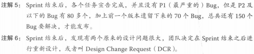 书中提供了一个实际项目的燃尽图,其中图片的注解5、注解6提到,Sprint结束后遗留了大量Bug,并且存在两个很大的设计问题,需要DCR。程序员写完功能后,看似完成了项目的80%,但剩下的“20%往往要花费80%的时间”。在写完全部功能后再返工修改前期开发的Bug,难度往往要大于阶段性的复查并修改。如果我们能放弃冲刺,平稳推进,是否更利于整体开发效率的提升呢?