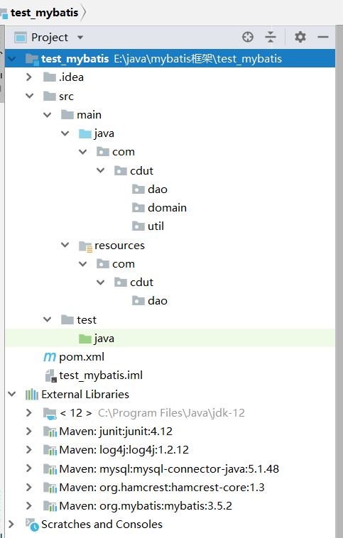 pom.xml为maven的配置文件,并导入依赖, mybatis测试的工程,需要mybatis包,数据库mysql的连接,junit用于测试,log4j日志组件