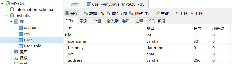 public class User { private Integer id; private String username; private String address; private Character sex; private Date birthday; //并设置相应的get和set方法 //设置toString方法 }
