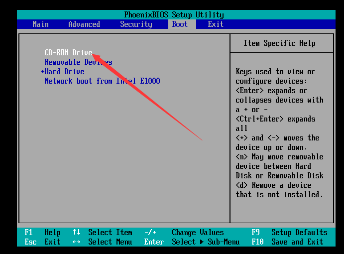 将CD-ROM Drvie 使用+号调至第一位,F10保存!