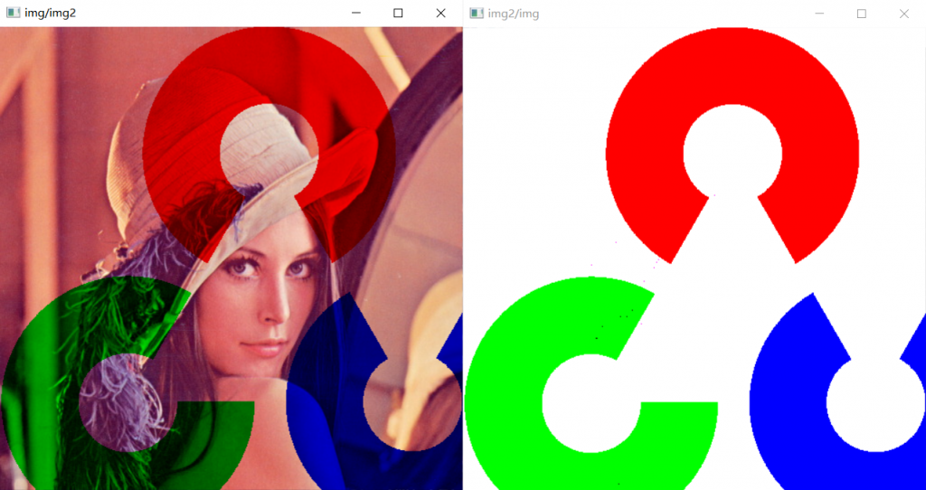下面的例子分别用lena.jpg和opencv-logo.png互相作为除数和被除数计算: