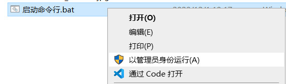 发生这种错误一般是因为启动cmd是以普通用户打开的,需要用管理员身份启动命令行,可以新建”启动命令行.bat”文件,文本方式打开输入“cmd”保存,右键“以管理员身份运行”:
