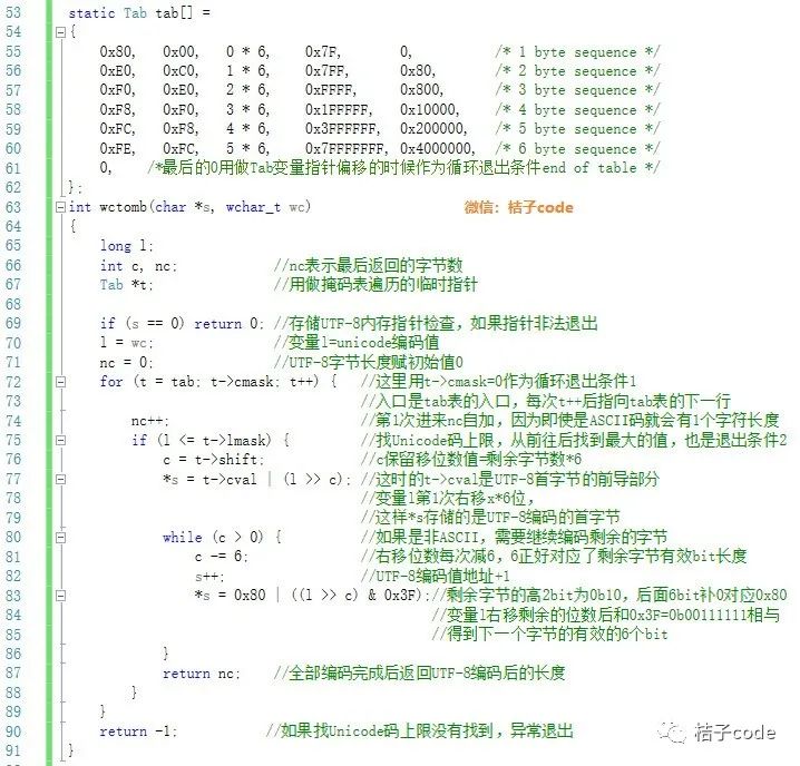 在编码函数for循环中查找tab表,每次移动一行,通过lmask找到Unicode的编码范围,如果找到了则提取shift值赋值给变量c,并作为首字节有效bit的位移数,如果c大于0需要继续编码剩余的字节,c每次自减6用Unicode编码数值右移c位,再和0x3F相与得到剩余字节的6个有效bit位。