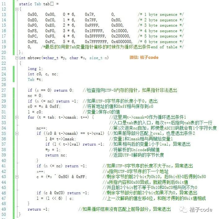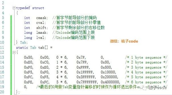 在解码函数中,首先保存首字节内容,在循环中查找tab表,每次移动一行, 当首字节和前导部分掩码相与后,如果等于前导部分的值查表结束,检查解码值的范围退出,如果不等于前导部分的值,则继续解码后面的剩余字节。解码剩余字节设计的比较巧妙,用这个值和0x80异或,这样一个操作既能得到剩余字节的有效6bit值,也能很快得到剩余字节的前2个bit是否等于0b10。