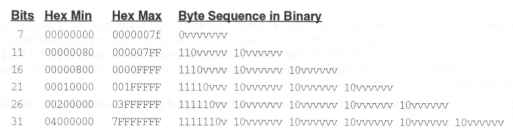 这样表示0~0x7FFF FFFF范围内Unicode数值的UTF-8编码就是下图这样子的,其中v表示Unicode的有效bit位: