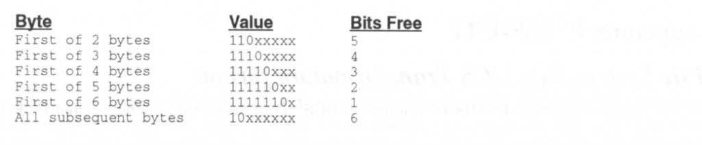 从查找表可以看出第1列是首字节前导部分的掩码,首字节和该掩码相与得到的是首字节的前导部分;第2列是首字节前导部分补零后的值;第3列采用x*6的形式,x等于编码后的字节长度-1,Unicode编码值右移x*6位得到的是首字节中有效bit组成的数值;第4列对应的是Unicode编码范围的上限;第5列对应的是Unicode编码范围的下限。