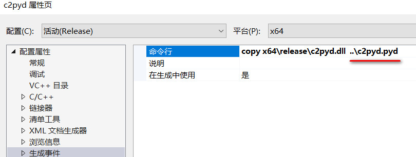 在生成事件中添加一条BAT命令,修改dll文件后缀为pyd,更符合Python使用习惯,同时自动会拷贝到你希望存放的位置: