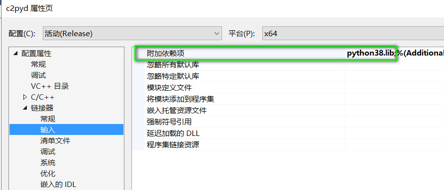 添加附加依赖项python38.lib: