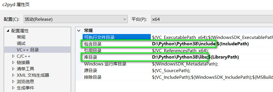 添加Python头文件和lib文件目录,因为VS编译的是64bit的dll(pyd)文件,则需要选择64bit库文件的目录。这里D:\Python\Python38目录下安装的是64bit的Python解释器,在 D:\Python\Python38\libs目录下的lib文件就是64bit的静态库文件,如果安装了不同bit版本的解释器需要找到相应的路径添加。