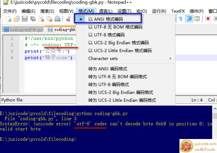 第2行的 ”-*- coding: UTF-8 -*-” 的作用是告诉Python解释器这个源码文件所采用的编码方式是UTF-8。本着猎奇的心理,我们来看下用其他的编码方式保存源码文件试试。 在notepad++的格式选项下可以选择保存文件的格式,“以UTF-8无BOM格式编码”就是指UTF-8编码格式 。