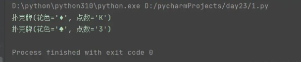 from collections import namedtuple p = namedtuple('扑克牌', ['花色', '点数']) res1 = p('♦', 'K') res2 = p('♣', '3') print(res1) print(res2) # 输出变量名就会答应扑克牌的花色和点数