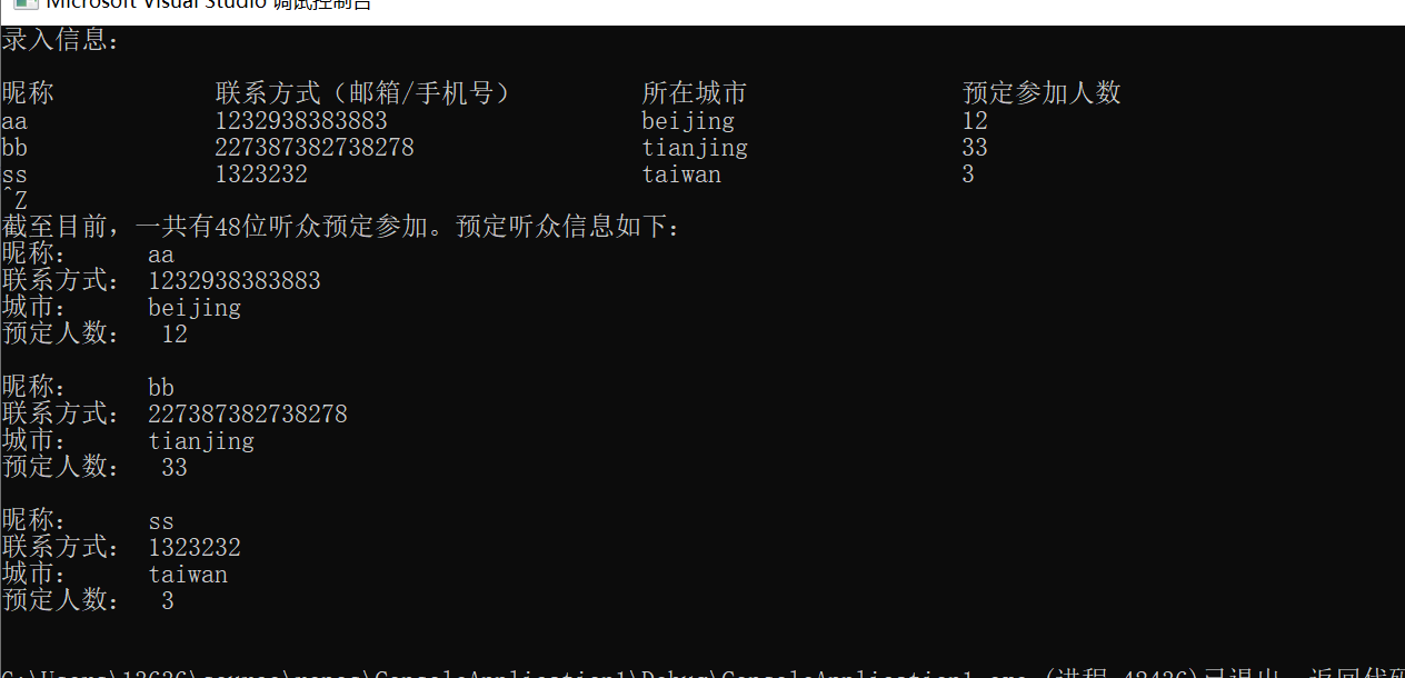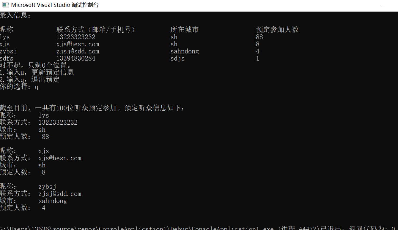 #include<iostream> #include<string> using namespace std; class info { private: string nickname, contact, city; int n; static int a; public: info(string ni, string co, string ci, int nn) :nickname(ni), contact(co), city(ci), n(nn) { a += n; } info() :nickname("n"), contact("co"), city("ci"), n(0) {} void print()const; static void printa(); static int geta() { return a; } }; int info::a = 0; void info::print()const { cout << "昵称: " << nickname << endl; cout << "联系方式: " << contact << endl; cout << "城市: " << city << endl; cout << "预定人数: " <<n<<endl << endl; } void info::printa() { cout << "截至目前,一共有" << a << "位听众预定参加。预定听众信息如下:"<<endl; }