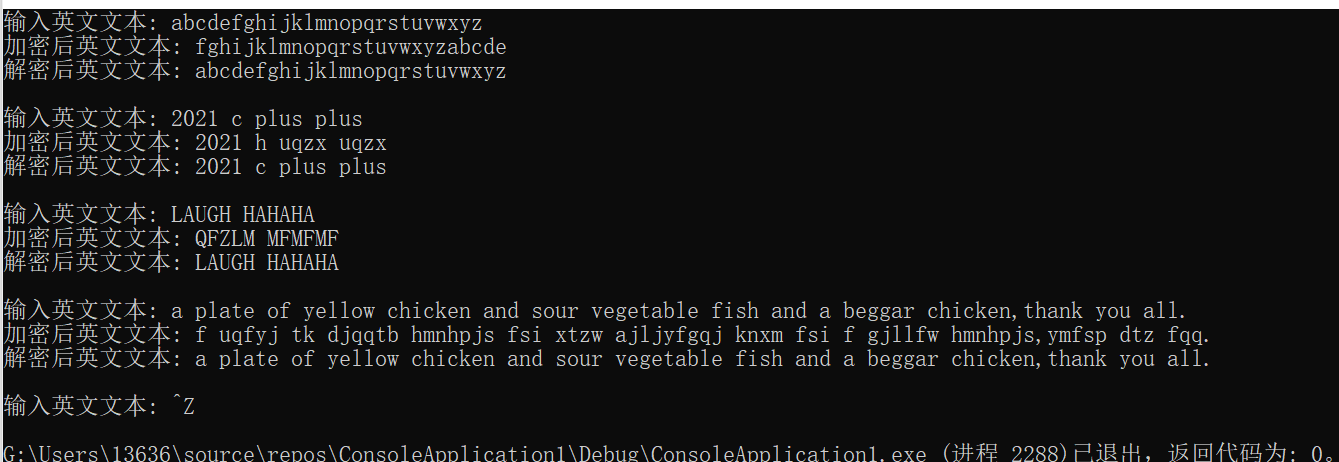 #include<iostream> #include<string> using namespace std; class TextCoder { public: TextCoder(){} TextCoder(string t):text(t){} string get_ciphertext(); string get_deciphertext(); private: string text; void encoder();//形参列表为空! void decoder(); }; void TextCoder::encoder() { for (int i = 0; i < text.length(); i++) { if (('a' <= text[i] && text[i] <= 'z') || ('A' <= text[i] && text[i] <= 'Z')) { if (('v' <= text[i] && text[i] <= 'z') || ('V' <= text[i] && text[i] <= 'Z')) { text[i] = text[i] - 21; } else { text[i] = text[i] + 5;} } } } string TextCoder::get_ciphertext() { encoder(); return text; } string TextCoder::get_deciphertext() { decoder(); return text; } void TextCoder::decoder() { for (int i = 0; i <text.length(); i++) { if (('a' <= text[i] && text[i] <= 'z') || ('A' <= text[i] && text[i] <= 'Z')) { if (('f' <= text[i] && text[i] <= 'z') || ('F' <= text[i] && text[i] <= 'Z')) { text[i] = text[i] - 5; } else { text[i] = text[i] + 21;} } } }