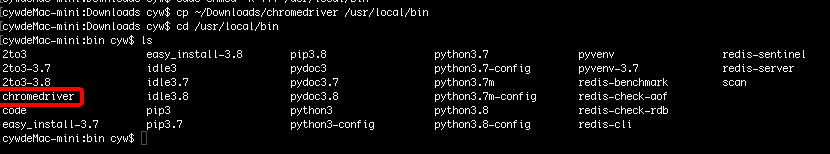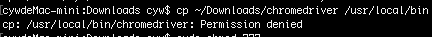cywdeMac-mini:Downloads cyw$ cp ~/Downloads/chromedriver /usr/local/bin ( ~代表当前目录)