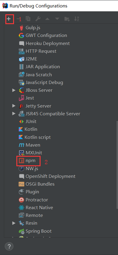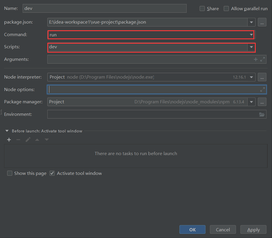 配置红色标注起来的Command为install(首次运行前先要安装npm)、Node interpreter(NodeJs的安装路径,一般默认已经关联上了)和Package managen(npm管理路径,一般默认已经关联上了)