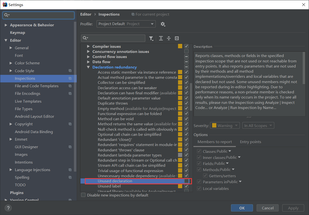 File-->Settings-->Editor-->Inspections-->Java-->Declaration redundancy-->Unused declaration的勾去掉。