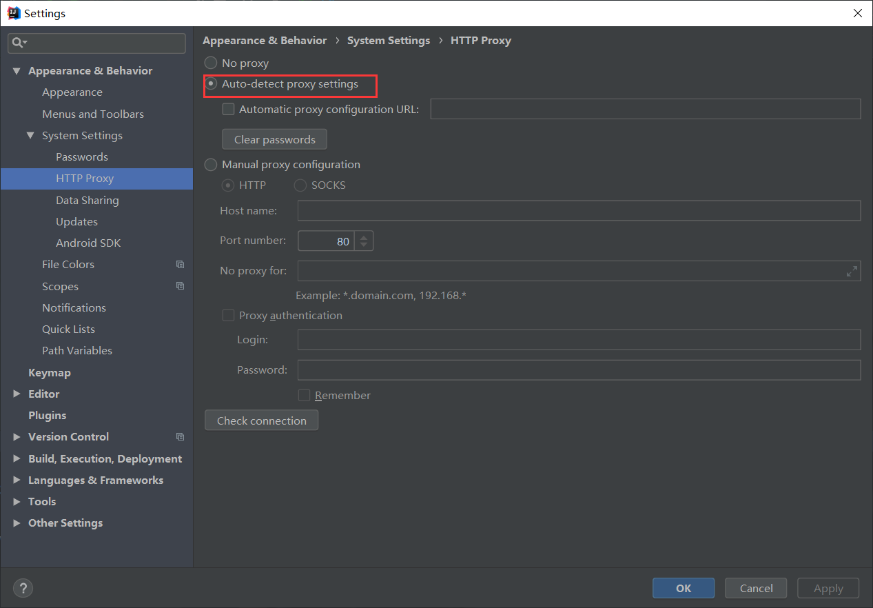 - 勾选auto-detect proxy settings