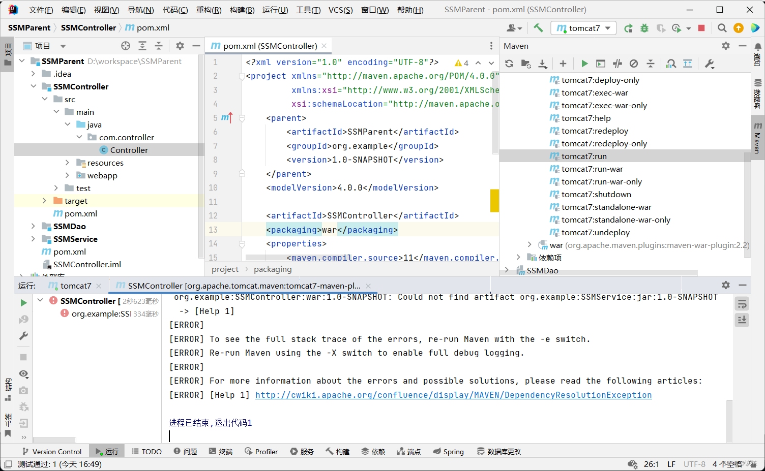 我今天写SSM整合中,简单的将Dao层(及其依赖),Service层还有Controller层分别独立写到不同模块,在运行时tomcat总是启动不了,说是Service无法找到Dao的包,在确定各方面没问题后,我觉得是在加载包时候出了问题