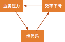烂代码产生的常见原因是业务压力大,导致没有时间或意愿讲究代码质量。因为向业务压力妥协而生产烂代码之后,开发效率会随之下降,导致业务压力更大,形成一种典型的恶性循环。