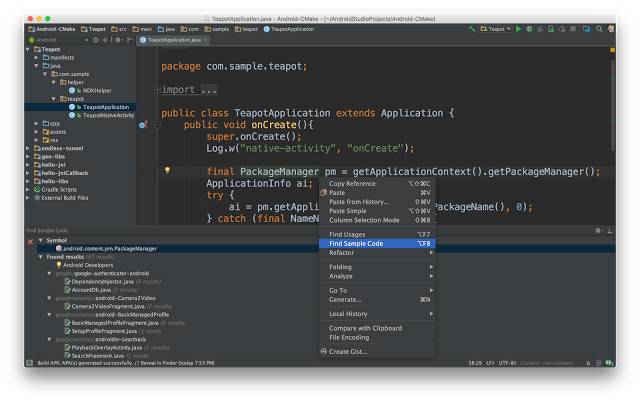 上图可以看到,以选中 PackageManager 为例,下面直接出现了一些 Google Sample 相关的代码,方便你快速查找该类的用法,而且还有个链接直接指向到 Android Developer 官网该类的详细介绍,简直不要太方便,我喜欢这功能!