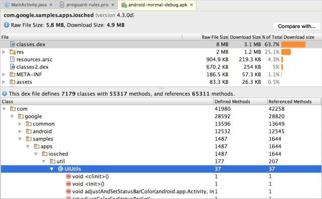 分析器,现在可以很方便的使用 Android Studio 进行 APK 分析。具体用法点击 Build -> Analyze APK 然后选择你要分析的 APK 文件就可以了。